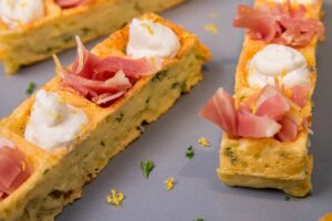 Bâtonnets de gaufres de pommes de terre au jambon d’Ardenne et à la ricotta