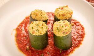 Courgettes farcies à la crème de pommes de terre, lard et persil
